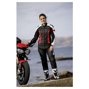 Avec sa veste de combinaison en cuir Vermont robuste, la société Büse présente un vêtement particulièrement sportif rouge/noir/blanc. Les inserts métalliques indéformables et visibles au niveau des épaules soulignent ce style.